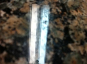 I recently purchased a light recommended by the studio painters at privateer press (LSF 150). It came with 2 unknown 15 watt 18″ T8 bulbs with a stated color rendering index (CRI) of 80. I picked up some GE ‘sunlight bulbs’ with a CRI of 90. The iPhone camera couldn’t deal with direct pics of the bulbs, but could handle the reflection (in this case, a granite countertop). The ‘warmer/yellower’ light on the left is the new GE bulb vs. the greener default light on the right.