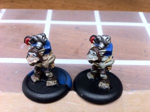 I applied a single coat of Krylon UV-Resistant Clear Matte Acrylic Coating over the frosted Games Workshop Purity Seal and it ‘erased’ the frosting experienced with the purity seal. While I can’t vouch for the durability of the krylon matte acrylic coating, it didn’t frost. Temp in the garage is roughly 65 degrees Fahrenheit and 67% relative humidity. Below the Bodger on the left has one coat of ‘frosted’ purity seal and one coat of the Krylon coating. The Bodger on the right has no varnish or finish of any kind. I think the more reddish hue of the bodger on the left was proably just a stronger Reaper ‘flesh’ wash and has nothing to do with the finish.