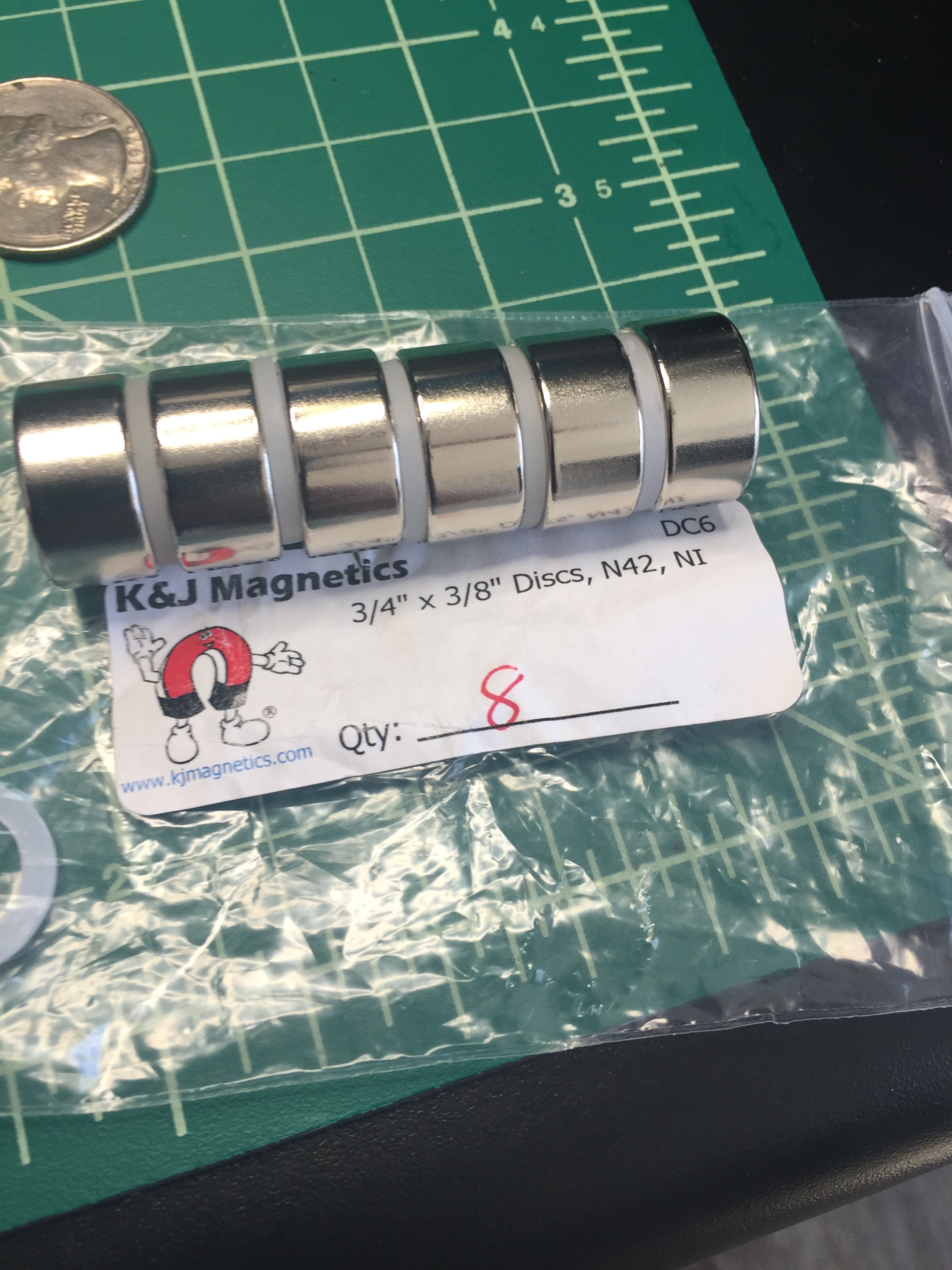 So far, I’ve purchased 3/4″ diameter by 3/8″ thick neodymium magnets. These puppies have a pull force of around 24 pounds when it’s magnet to magnet.