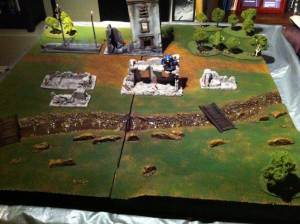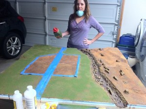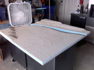 Here is the first completed terrain board! It is 2 2′ x 4′ 1/2″ plywood sections covered with a base of 1″ extruded ‘blue’ insulation foam, and then up to two additional 1″ layers of foam formed into hills. A Hotwire Foam Factory 8″ Pro Hot Knife was used to cut out the river and form the hills.